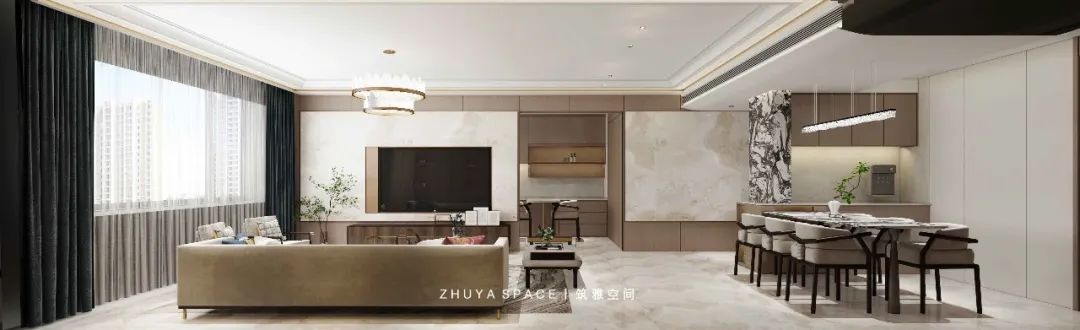 開闊的視野、大氣的基調加之軟配的潤色更好提升了整個空間的奢華感優(yōu)雅而不失舒適,二者相互交融使居者經(jīng)歷一天的喧囂與疲憊回到家拋卻一切煩惱和憂慮,享受生活的美好。