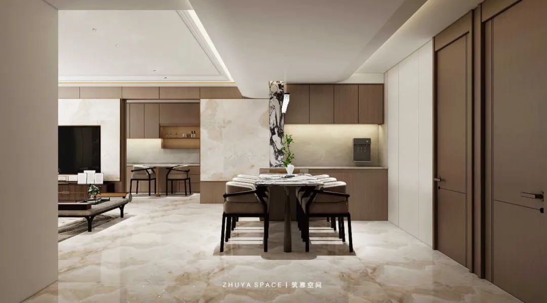 餐廳部分采用經(jīng)典木色與理石搭配帶來更豐富的視覺層次,整體線條簡潔、結構豐富簡潔美觀的同時又突顯居者品味不凡的氣質